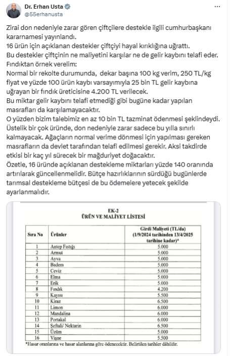 İYİ Parti Genel Başkan Yardımcısı ve Samsun Milletvekili Dr. Erhan Usta’dan Zirai Don Desteğine Tepkisi: “Çiftçi Hayal Kırıklığına Uğratıldı”