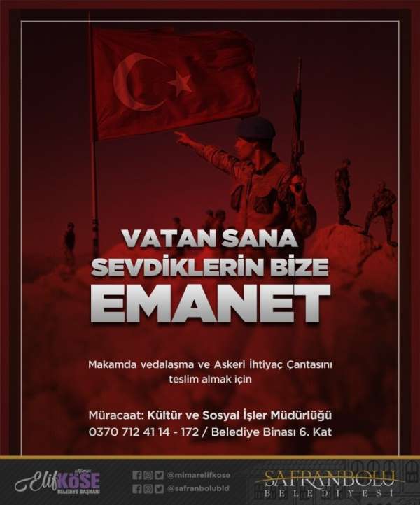 Askeri ihtiyaç çantasını teslim almak için belediyenin Kültür ve Sosyal İşler Müdürlüğüne müracaat edilebilecekleri ifade edilen açıklamada, Safranbolu Belediye Başkanı Elif Köse'nin, vedalaşmak üzere makamında ağırlayacağı er adaylarına bir de moral mektubu ileteceği kaydedildi.