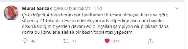 'Çok değerli Adana Demirspor taraftarları TFF resmi olmayan kararına göre Süper Lig 21 takımla devam edecek. Yani Adana Demirspor Süper Lig'e alınmadı hayırlısı olsun. Kaldığımız yerden devam edip inşallah şampiyon olup çıkarız. Daha sonra bu konularla alakalı bir basın toplantısı yapacağım.'