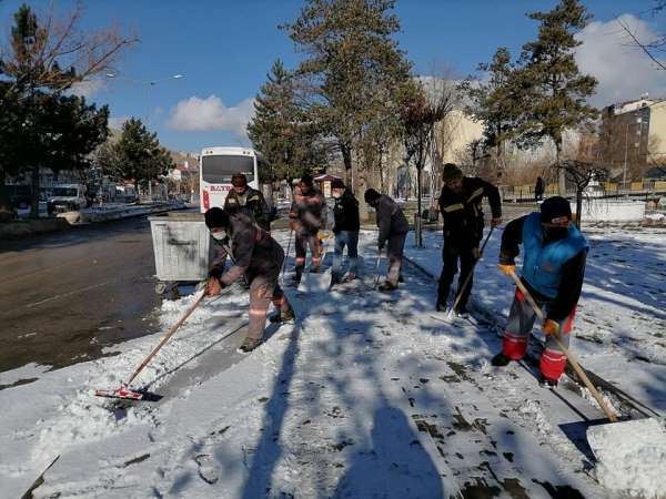 Belediye ekipleri, sokak araları ve kaldırımlarda biriken karları küreklerle kürüyerek süpürdüler.