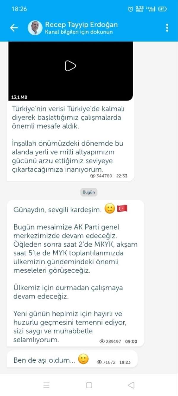 Cumhurbaşkanı Recep Tayyip Erdoğan, Telegram ve Bip üzerinden, 'Ben de aşı oldum