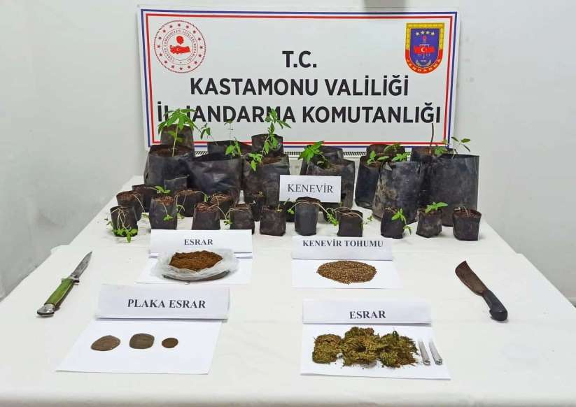 Edinilen bilgiye göre, Kastamonu İl Jandarma Komutanlığı ekiplerince uyuşturucu madde imal ve ticareti yapan şahıslara yönelik yürütülen çalışmalar neticesinde, Kastamonu'nun İnebolu ilçesinde Y.T. isimli şahsın evinde arama yapıldı. Yapılan aramada plaka haline getirilmiş bir miktar esrar ve esrar yapımı için dikilen kenevirler ele geçirildi.